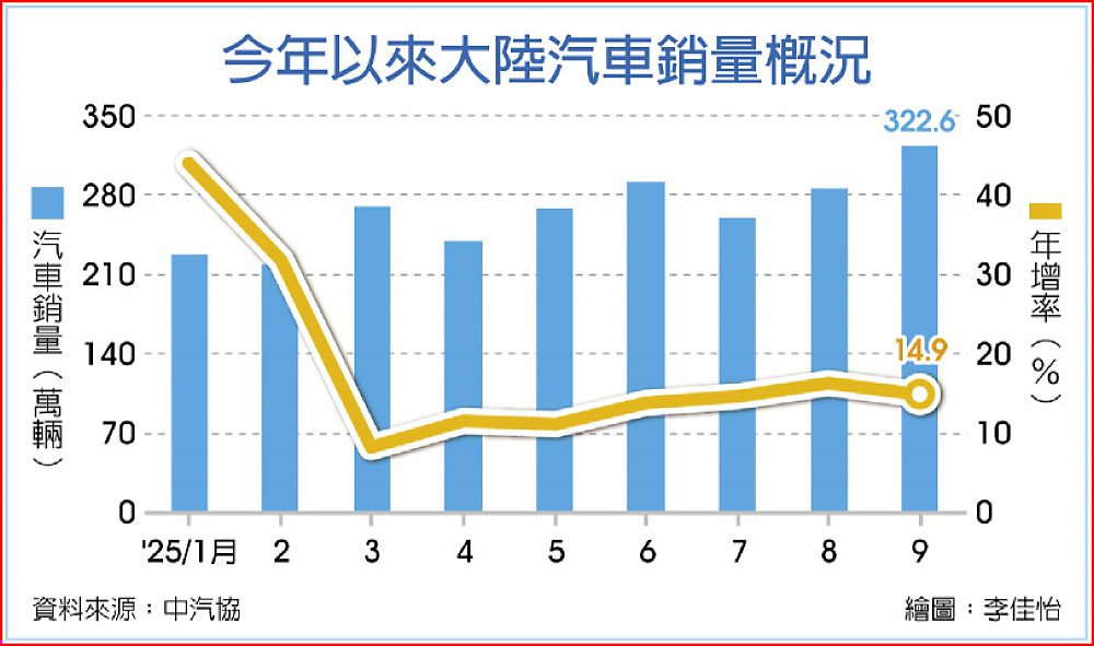 華夏時報報導,儘管市場內部競爭激烈,但整體規模仍在擴張。中汽協14日公布數據顯示,9月大陸汽車產銷量分別為327.6萬輛與322.6萬輛,年增率達17.1%及14.9%,是史上首次在9月份產銷雙雙突破300萬輛。