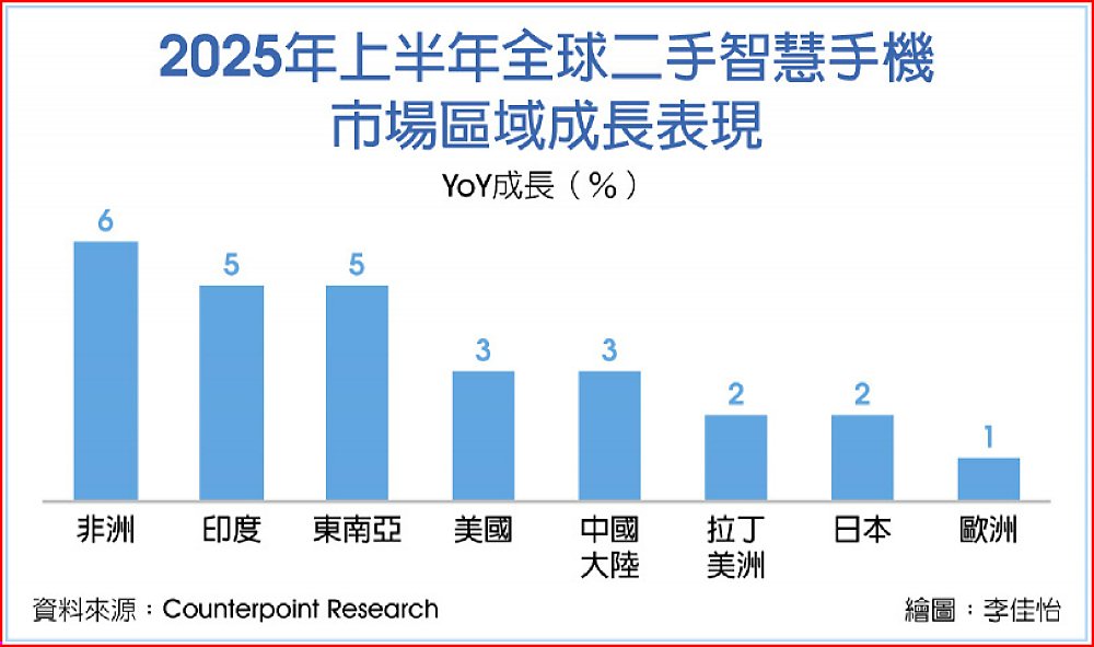 Counterpoint Research發布《全球二手智慧型手機市場報告》,2025年上半年全球二手手機市場呈現明顯區域分化。美歐日等成熟地區受市場飽和與消費者換機週期延長影響,銷售僅微幅成長約1%,表現趨於平穩;相較之下,新興市場如非洲、印度、東南亞、中國與拉丁美洲等區域展現強勁動能,平均年增率達4%,成為推動全球市場成長的主要引擎。