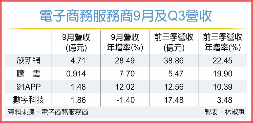 受惠品牌商及實體通路商提前備戰雙11檔期,電子商務服務商9月營收繳佳績。欣新網9月營收4.71億元、年增28.49%,創歷年同期新高;騰雲9月及第三季分別創下單月單季新高;91APP的9月合併營收1.48億元,創同期歷史新高。網路交易平台商數字科技,第三季及前三季營收均創下歷史同期新高。
