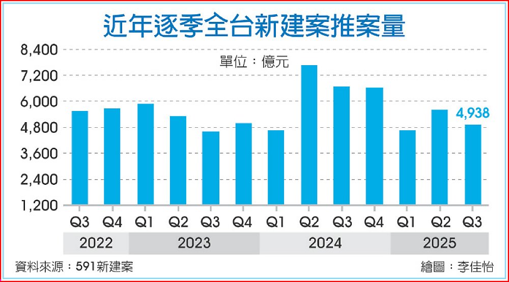 即使有新青安房貸鬆綁、中央銀行延長換屋期限等利多,由於對提振房市效果仍有限,喚不回建商推案的信心。591新建案市調顯示,第三季全台建案推案量僅4,938億元,季減12%、年減26%。