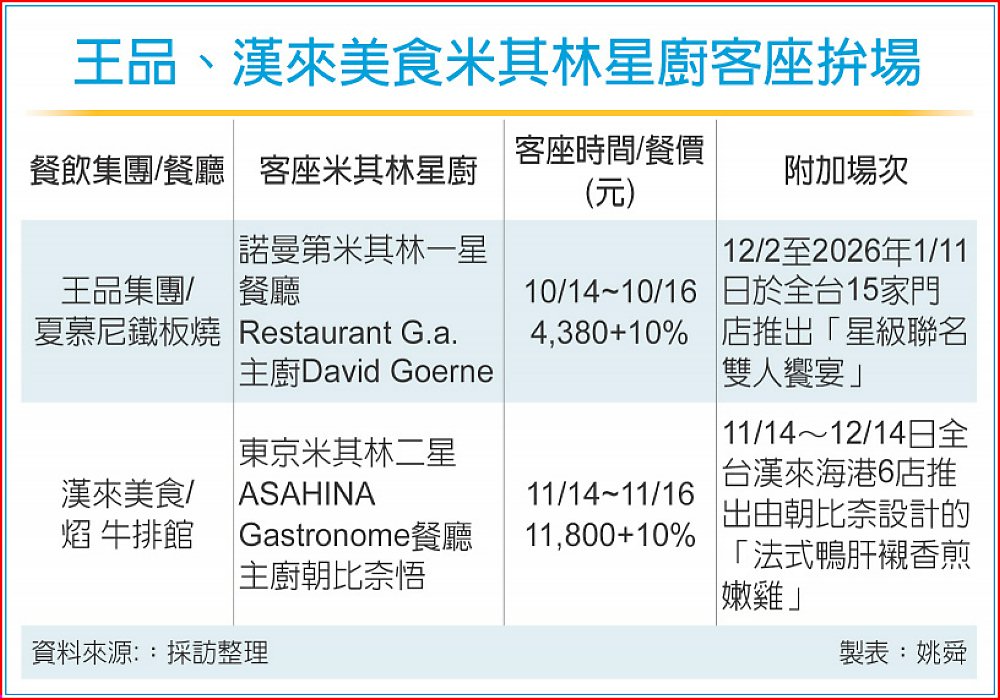 邀請米其林星廚客座不再是國際觀光飯店與高檔餐廳專屬,為開拓高端餐飲客群,王品集團旗下「夏慕尼」鐵板燒、漢來美食集團「焰 牛排館」,分別請到法國與日本米其林餐廳名廚客座,創連鎖餐飲集團先例。