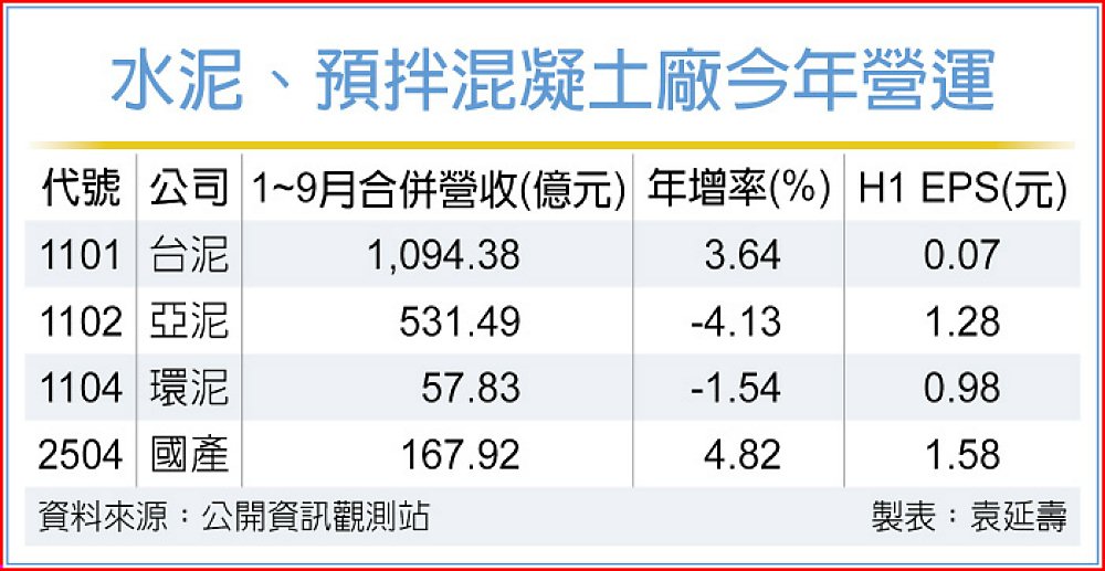第四季一向是水泥、預拌混凝土廠的傳統產業旺季,台泥(1101)、亞泥(1102)、環泥(1104)、國產建材(2504)等企業,對房地產、廠辦及商辦工程進入年底趕工潮對水泥、預拌混凝土需求的增加都持正向看待。