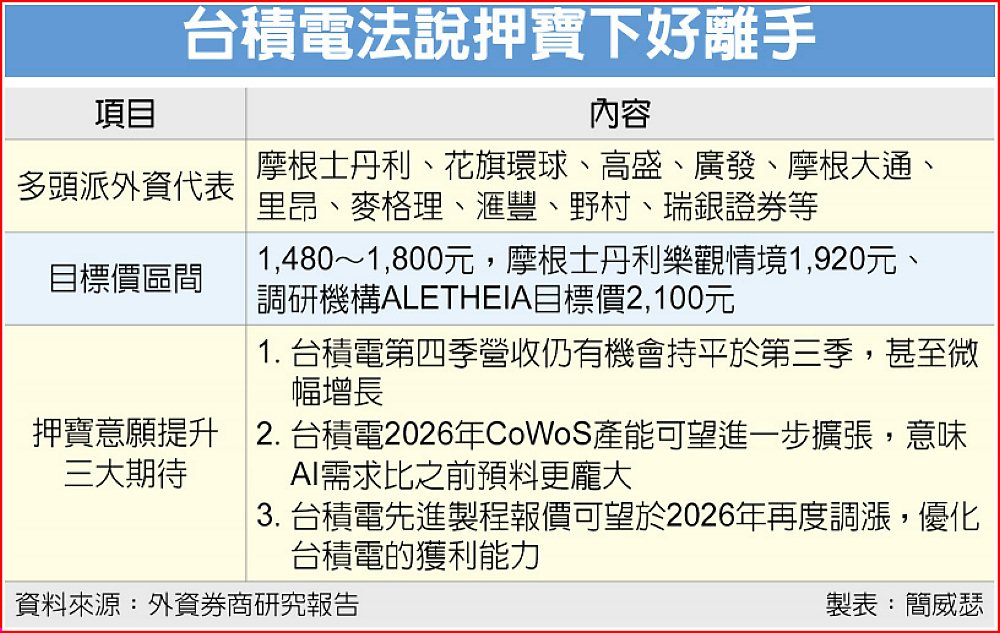 外資過往於台積電法說會前調升目標價相對少見,7月法說會起轉變,隨市場對AI續航力疑慮緩解,搶先調升目標價風氣延續到本次法說會。