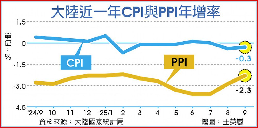 大陸統計局城市司首席統計師董莉娟表示,9月消費市場運行總體平穩,扣除食品和能源價格的核心CPI年增1%,漲幅連5個月擴大。生產者物價指數(PPI)9月年減2.3%,降幅比8月收窄0.6個百分點;今年前9個月PPI下滑2.8%。至於9月PPI降幅收窄至七個月最小,除因去年基數走低之外,各項宏觀政策效果持續顯現,「反內捲」帶動相關行業價格降幅收窄。此外,產業結構升級和消費潛力釋放,帶動相關行業價格上揚。