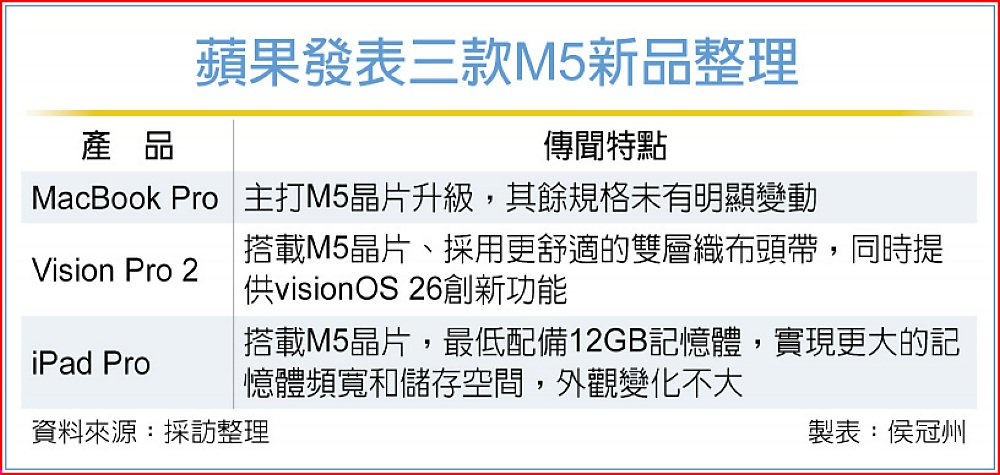 外媒先前報導蘋果將於10月推出14吋的M5 MacBook Pro,且配有M5晶片的iPad Pro及Vision Pro也可能同步發表,如今三款產品正式亮相。