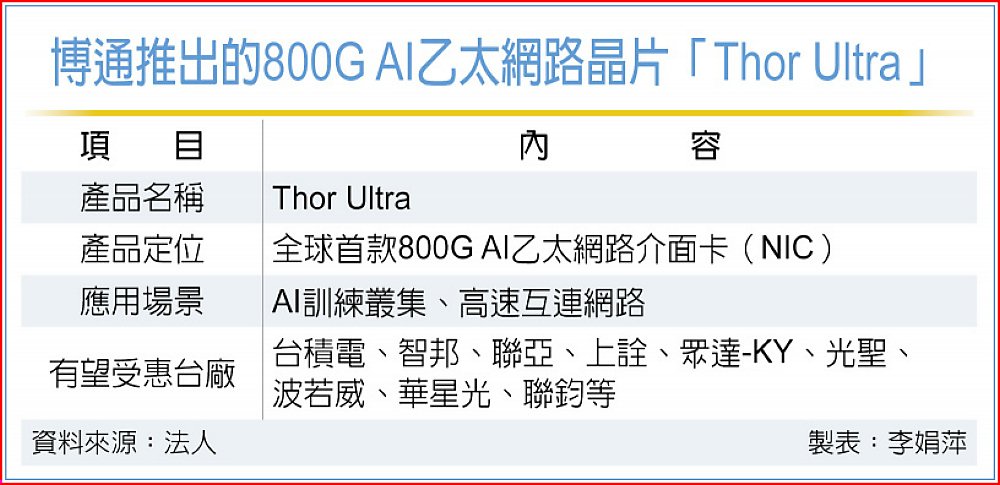 在系統端,網通大廠智邦預期為Broadcom Tomahawk/Thor Ultra主要ODM夥伴之一,負責開發高效能乙太網交換機與網路系統,並供應AWS、Meta、Google等雲端服務巨頭。