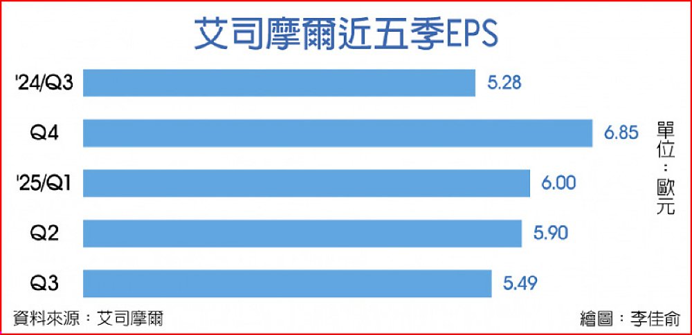 艾司摩爾第三季營收75.16億歐元,合乎公司預期但略低於市場預期的77.9億歐元。第三季淨利21.25億歐元,經調整後每股盈餘(EPS)5.49歐元,略高於市場預期的5.44歐元。該公司預期第四季營收介於92億至98億歐元之間,毛利率約在51%至53%之間。
