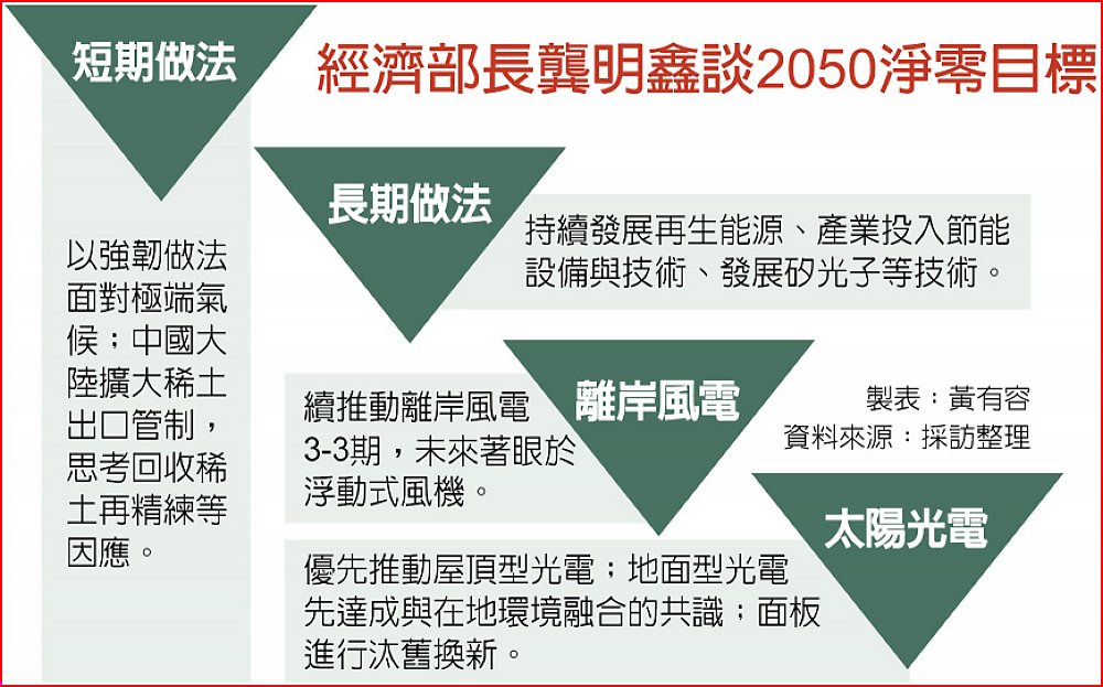 就長期目標而言,龔明鑫認為,台灣必須持續發展再生能源,這也是「重中之重」,否則將無法達到2050淨零碳排目標。