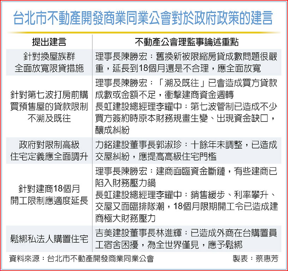 陳勝宏說,現在不論消費者房貸或建商土建融都還是難以取得貸款,就連財務體質較強的建商,也面臨財務壓力鍋的考驗,建請中央銀行鬆綁第七波不動產信用管制,去年第七波不動產管制之前已簽約購屋者應不溯既往。
