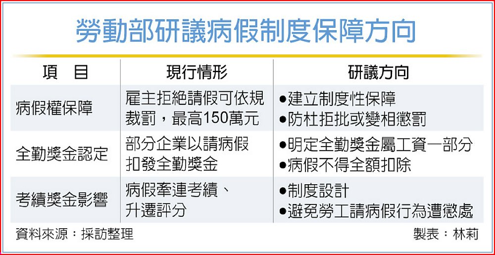 洪申翰指出,據過去勞動部許多函釋及法院判決,都認定全勤獎金應屬工資一部分,所以,若因請病假而遭沒收全勤獎金,是不合理現象,「也不應該是這樣。」勞動部近期已就相關制度進行研議,後續將透過制度性要求,明確保障勞工請病假的權利。