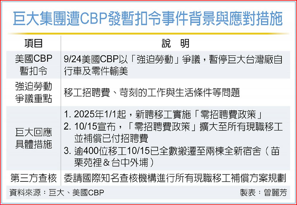 美國海關暨邊境保護局(CBP)9月24日針對自行車大廠巨大集團發布暫扣令,原因就是涉及「強迫勞動」爭議,關鍵指標包括移工招聘費、宿舍環境等問題。為具體落實移工權益提升,巨大集團15日宣布,擴大「零招聘費政策」的適用範圍,規劃補償所有在職移工過去所支付的招聘費用,巨大400多位移工也已全數搬遷至苗栗苑裡與台中外埔的兩棟全新宿舍。