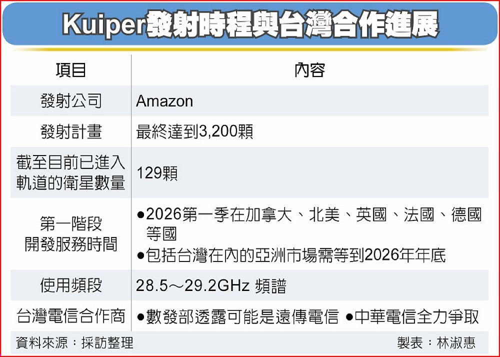 Amazon Kuiper衛星的發射時程據傳延遲,但2026第一季應該就會開通服務,但以加拿大、北美、英國、法國、德國等為主,不包括台灣,2026年底才會繞到亞洲來提供相關服務。