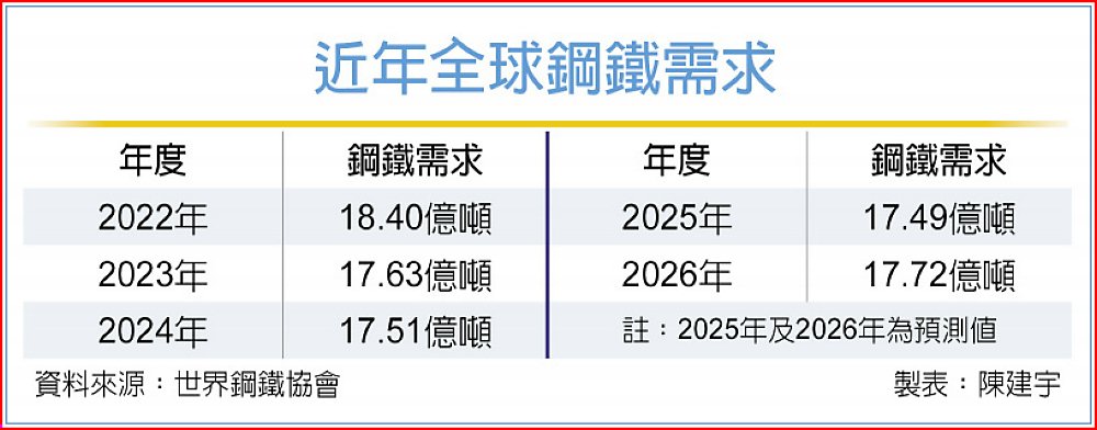 世界鋼鐵協會認為,明年鋼鐵需求增加的支撐力道,主要來自多國公共建設投資、融資環境放鬆,不過製造業成本高、消費受壓、貿易摩擦升溫,以及地緣政治不確定,可能成為今、明兩年主要風險。