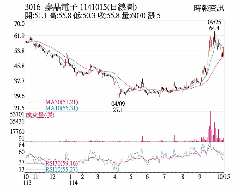 嘉晶(3016)15日股價強勢攻高,終場收在漲停板價55.8元,成交量放大至逾6,000張,表現亮眼。