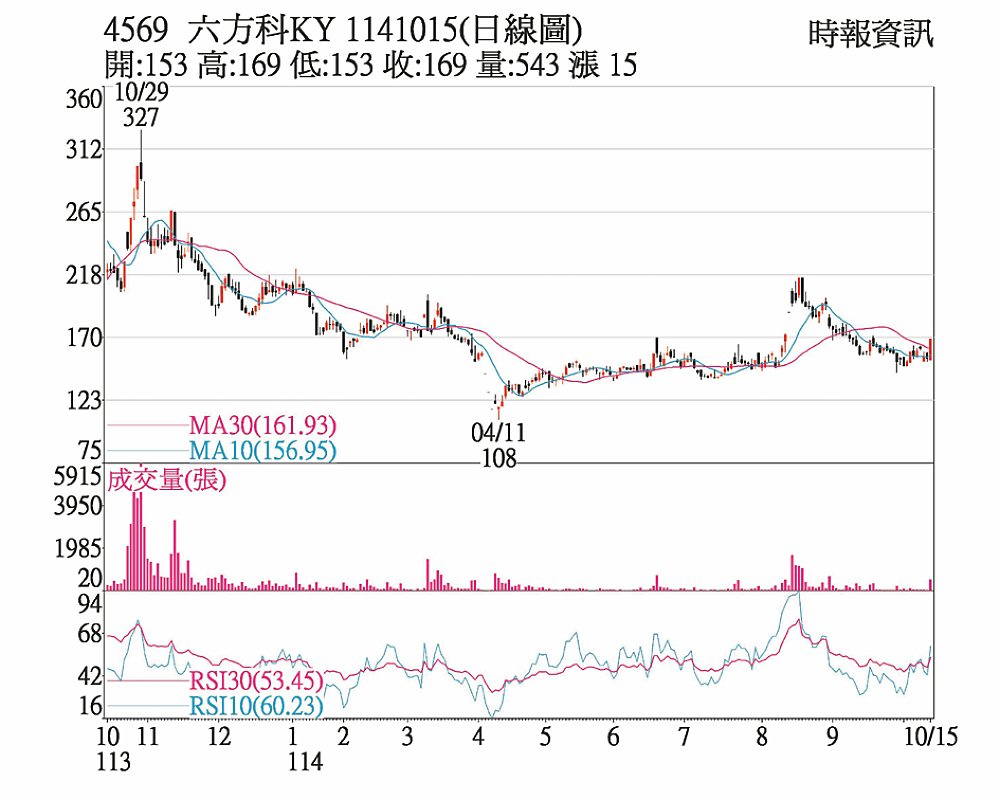 六方科-KY(4569)15日股價開低走高,盤中急拉至漲停後雖幾度再打開,不過終場收漲停價169元,拉長紅K棒,並成功收復短中長期各均線,五日、十日線轉揚,日KD亦呈走多格局,成交量535張,漲停委買量336張,惟外資由買轉賣超19張。