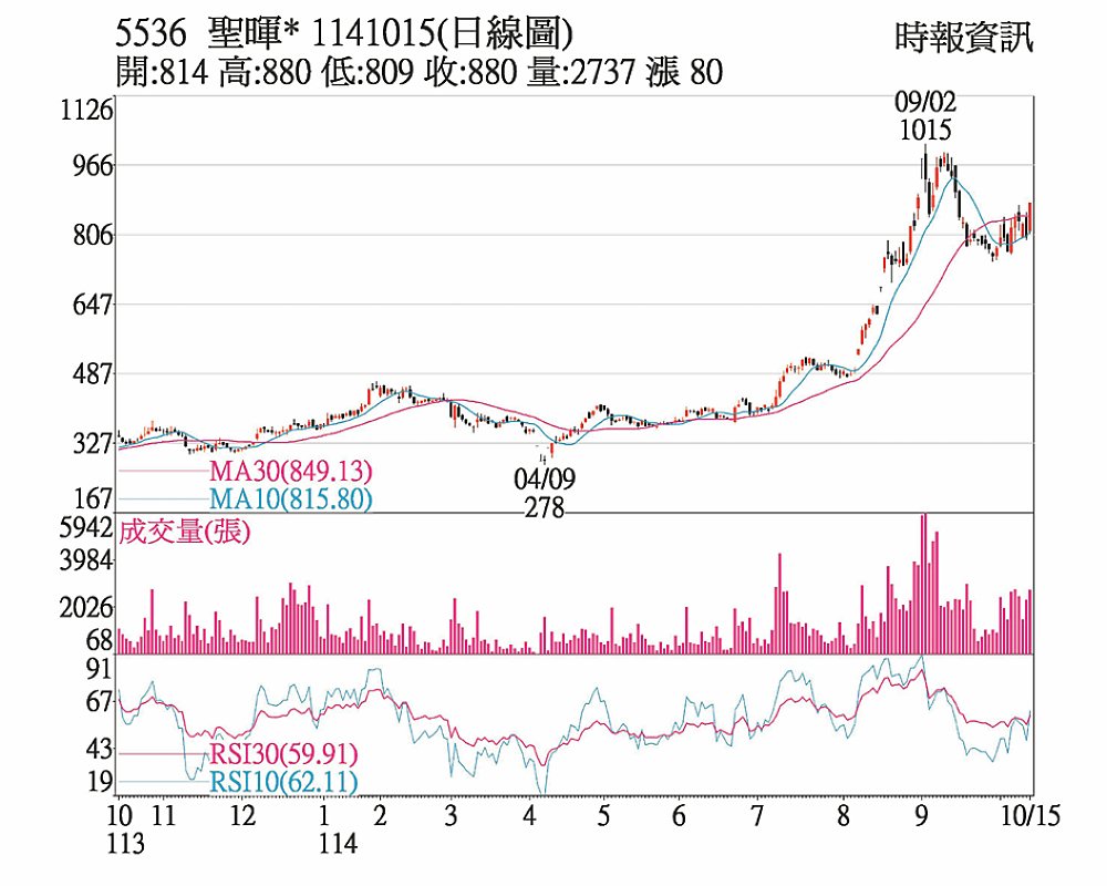 聖暉*(5536)15日放量強勢攻上漲停880元、大漲80元,成交量破2,600張,日KD交叉向上、MACD即將翻紅,技術面全面轉強。法人籌碼面上,投信近兩周持續買超,外資在連賣逾4,000張後,15日反手買超402張,三大法人合計買超逾600張。