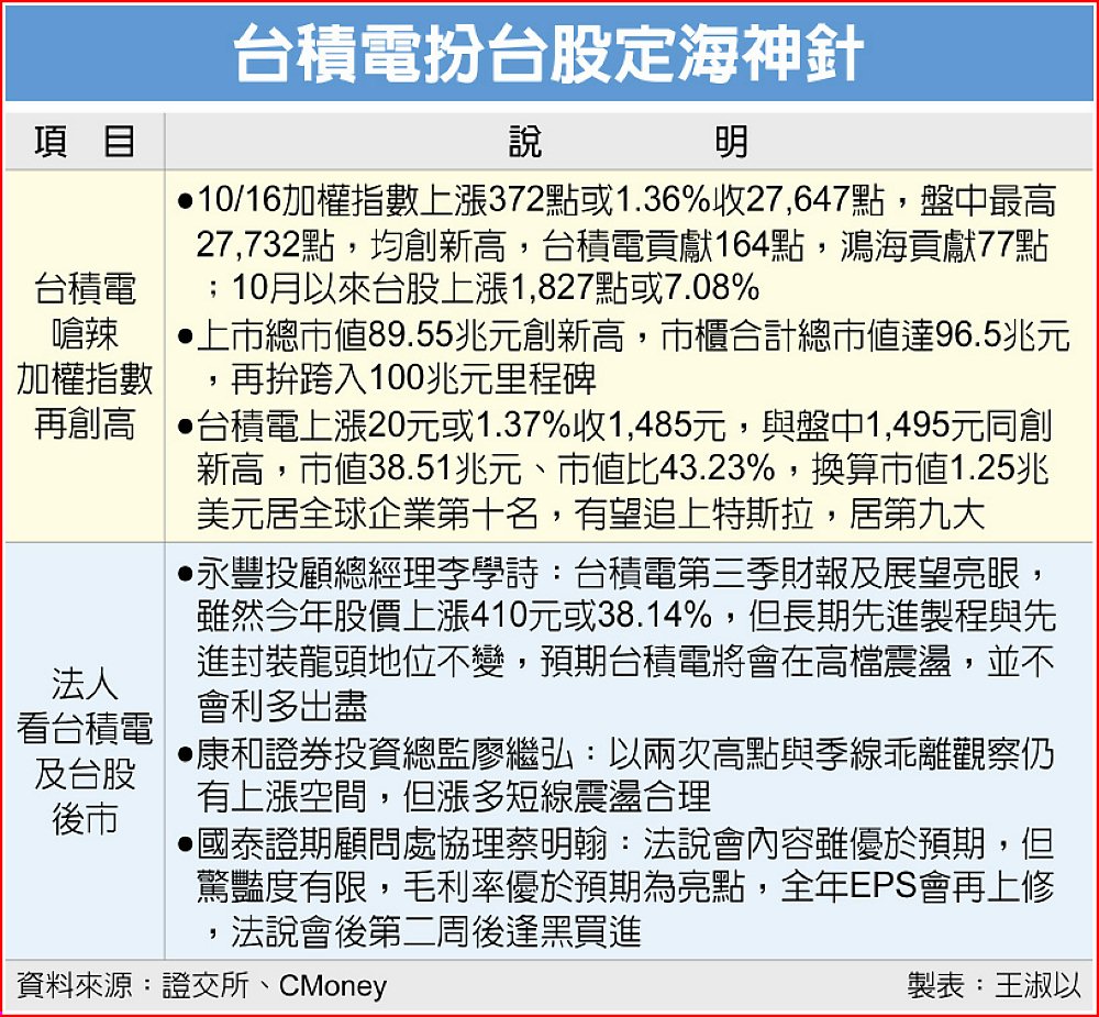 台積電16日上午股價盤中與收盤再創新高,終場漲20元至1,485元,盤中最高至1,495元;市值38.51兆元占總市值43.23%,折合約1.25兆美元,穩居全球第十大企業。