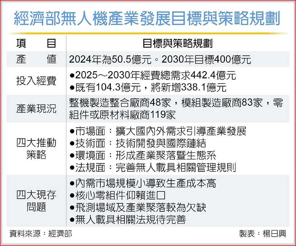 現況方面,台灣去年無人機產值50.5億元,主要業者約250家,包含最高等級整機製造整合廠商有48家,與美、日、波蘭、捷克等8國簽署MOU,並打入全球次大商用無人機公司Parrot、美國最大商用無人機公司Skydio的供應鏈。