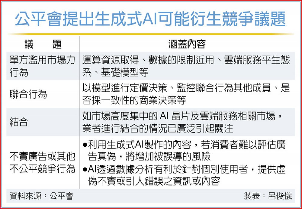 公平會7月擬具「我國生成式人工智慧相關之競爭法議題徵詢外界意見說明資料」,說明競爭法管制四大行為類型,包括單方濫用市場力、聯合行為、結合、不實廣告或其他不公平競爭行為,探討生成式AI可能衍生的競爭議題。