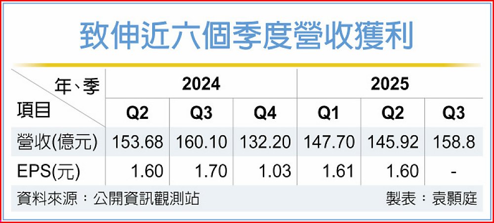 致伸第三季合併營收158.8億元,季增8.8%,累計今年前九月合併營收452.4億元,年增0.5%。致伸將於28日舉行法說會,董事長潘永中將首度主持法說會,除了公布第三季財報外,也將分享致伸長期策略和展望。