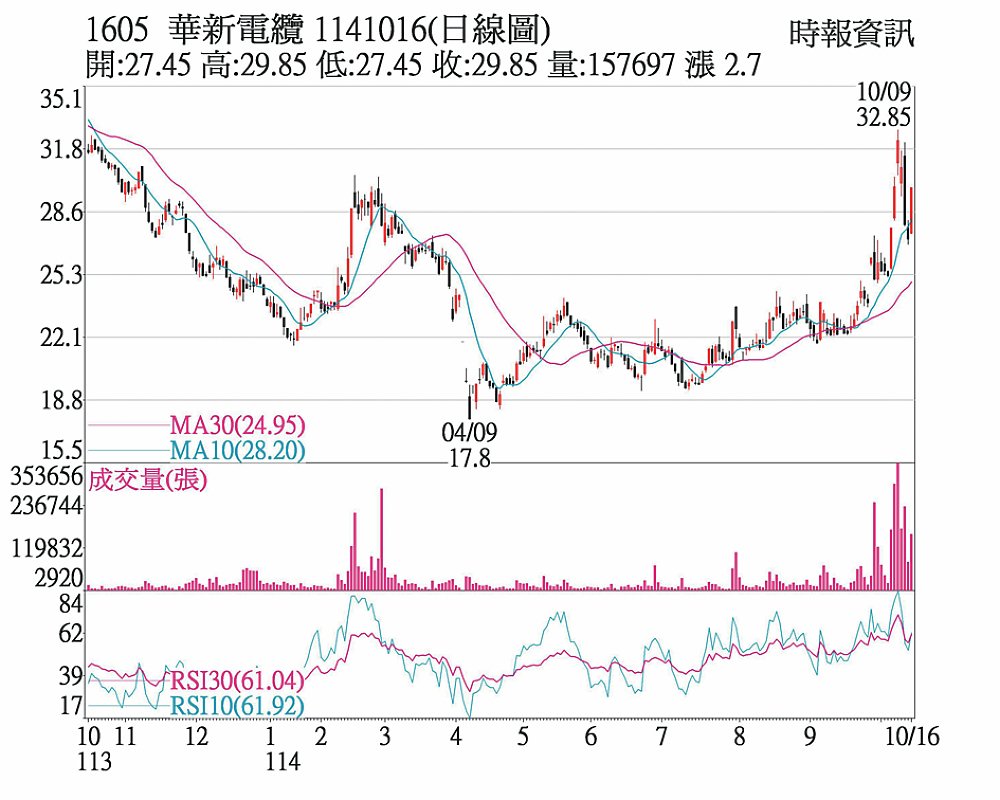 華新(1605)受惠於台電強韌電網計畫釋單與國際銅價上漲,16日儘管遭外資連續四個交易日賣出,投信16日也調節持股,自營商及市場追價買盤湧現,收盤前59分鐘亮燈漲停29.85元鎖死至終場,成交爆出15.72萬張巨量,上漲2.70元,一舉突破5日、10日均線反壓,所有技術線型全向上。