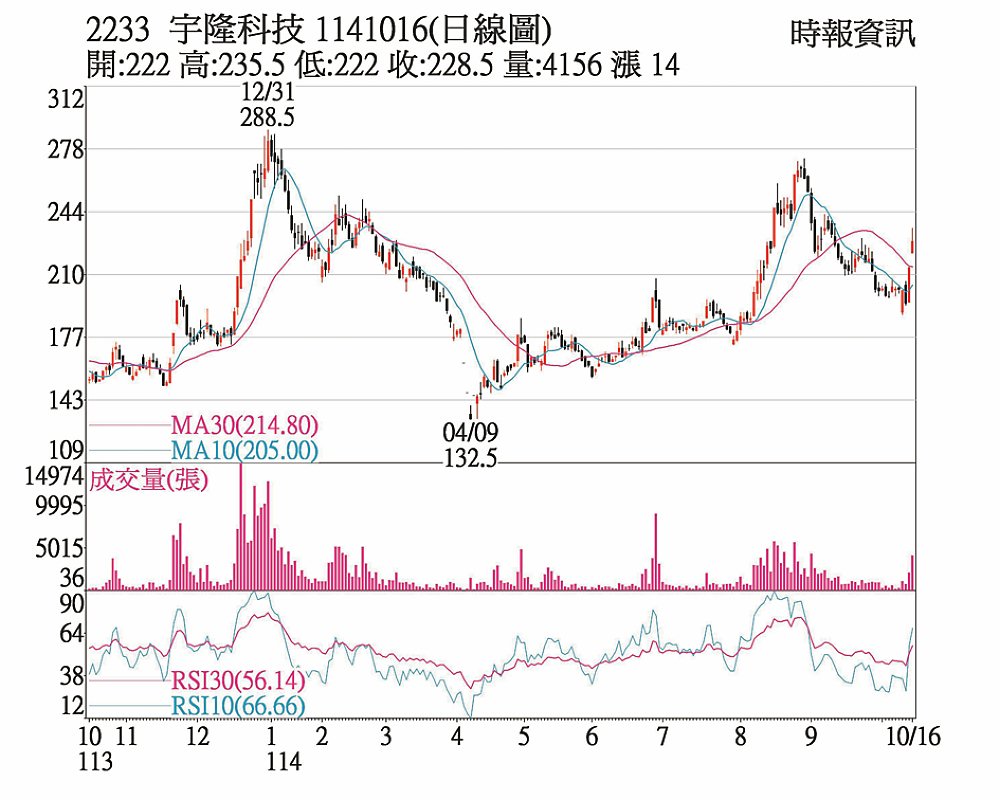 宇隆(2233)近期強勢表態,繼前一日攻上漲停後,16日盤中再度爆量拉上漲停235.50元,終場收228.5元、漲幅6.5%,成功站上季線,且5日、10日、月線呈多頭排列,技術面轉強,短線買盤明顯回流。後勢若能守穩220元支撐,有望挑戰前高壓力區。