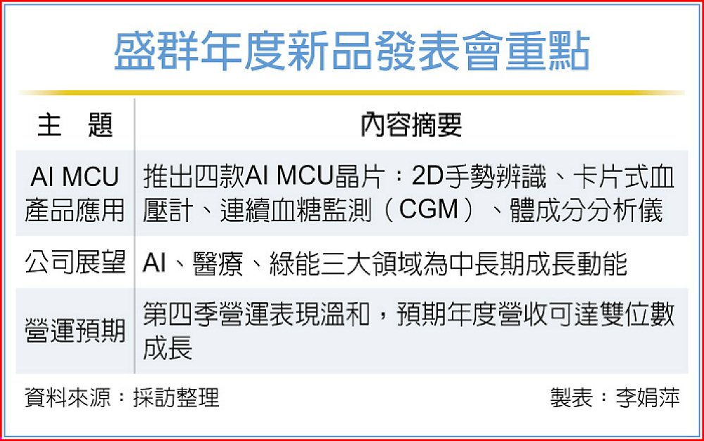 展望未來,蔡榮宗指出,AI、醫療與綠能三大領域將是公司中長期成長動能來源。隨AI MCU進入量產、AI伺服器散熱模組MCU通過國際大廠驗證並陸續出貨,盛群將持續優化產品組合與開發生態系。