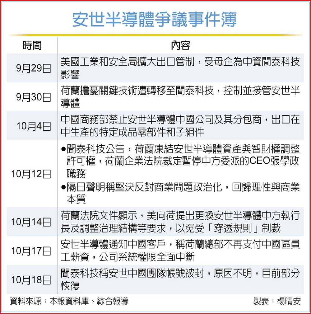美國拉攏盟友共同圍堵中國半導體,荷蘭日前接管控制中國半導體生產商聞泰科技旗下荷蘭子公司安世半導體(Nexperia),並凍結公司資產與智財權調整許可權。最新傳出,安世半導體全體中國區於17日遭停薪,且系統權限全面中斷,引發市場關注。