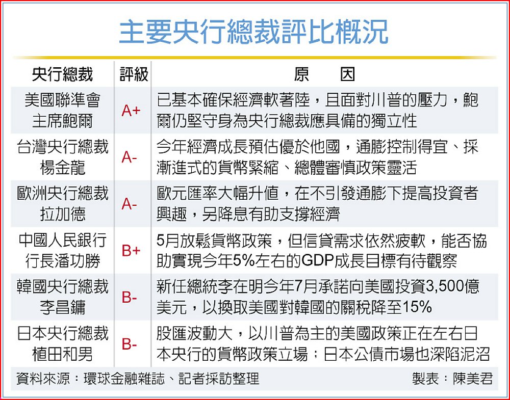 環球金融雜誌(Global Finance)發布全球央行總裁評比完整報告,我央行總裁楊金龍拿A-的原因出爐。環球金融雜誌指出,面臨美國總統川普的對等關稅政策,台灣今年經濟成長預估將達2.1%優於他國,且通膨控制得宜、採漸進式的貨幣緊縮,並展現靈活的總體審慎政策─第七波房市管制措施奏效,是楊總裁拿下優異A級成績的主因。