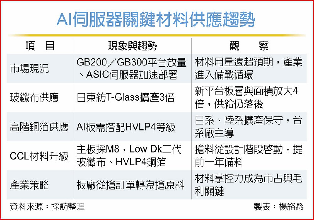 高階CCL須同時搭載超低介電玻纖布與超低輪廓銅箔,缺一不可,惟業者指出,雖然日東紡已啟動T-Glass產線擴建、預計產能翻倍,但新伺服器平台層數自20層倍增至40層,板面積亦明顯放大,使原物料消耗速度遠超擴產進度,即便新產線如期開出,仍難追上備料曲線,材料緊俏態勢短期難解。