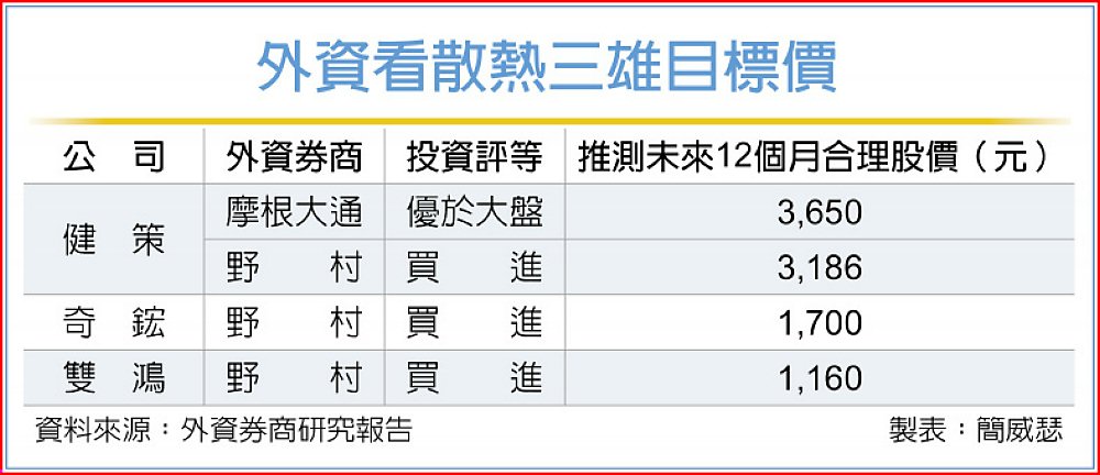 野村並重申對奇鋐、雙鴻「買進」投資評等,前者推測合理股價升至1,700元,雙鴻推測合理股價則從880元調高到1,160元,看好站穩千金地位。
