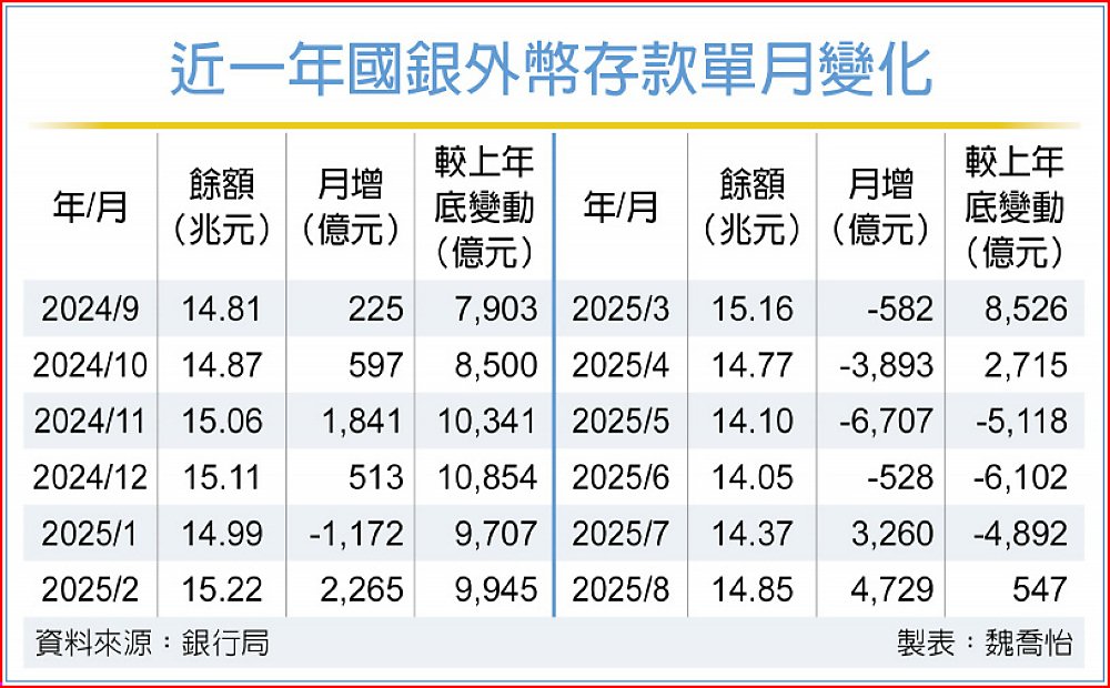 中信銀說明,8月外幣存款較前月增加571億元、月增4%,外幣活、定存均有成長,除法人客戶資金調度、美元升值外,主要仍和台灣出口金額持續成長有關,受惠AI應用及近月消費性電子備貨需求,出口持續創高,帶動貨款流入。