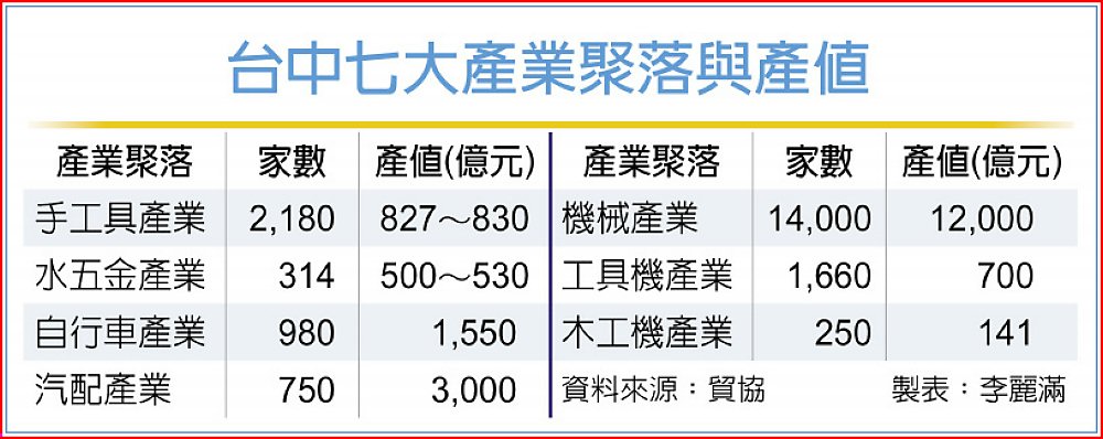 中部地區產業聚落,涵蓋工具機、手工具、五金、水五金、自行車、航太、機械、木工機、汽配等產業,分布於中彰投雲等地,產值逾2兆元,其中機械產業產值一年高達1.2兆元,臺中位於中臺灣產業樞紐,具備「前店後廠、一日訪展」的產業優勢,透過會展平台,國際買主可串聯展覽與工廠參訪,深化商務交流、加速合作機會。同時,臺中會展中心也將帶動中部地區的商業服務,包括茶、咖啡、禮品、文具、電玩、電競、動漫、旅遊、寵物、連鎖加盟等消費性展會,將中臺灣商業潛力加乘放大。