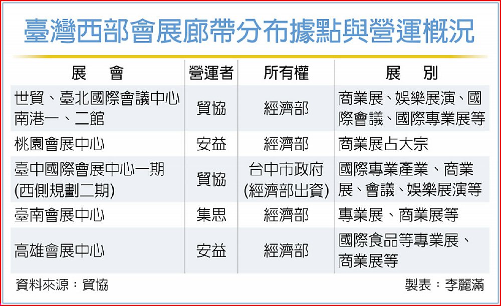 目前會展中心分布於臺北、桃園、臺南、高雄等地,均由經濟部興建,其中臺北世貿、南港一、二館等由貿協營運,桃園、臺南與高雄則由民間企業OT經營。