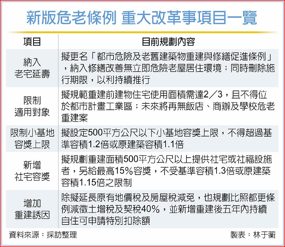考量實務上常見單一產權且非作住宅使用之旅館、百貨商場、銀行等商業建築依現行危老條例申請重建,導致有制度被資源較多的大型業者利用等爭議,因此,新版危老條例修法擬增訂,未來建築物申請重建時,限制重建前住宅使用須達2/3,以落實改善居住環境意旨,回歸住宅為主要適用對象,未來恐再無飯店、商辦及學校的危老重建案。