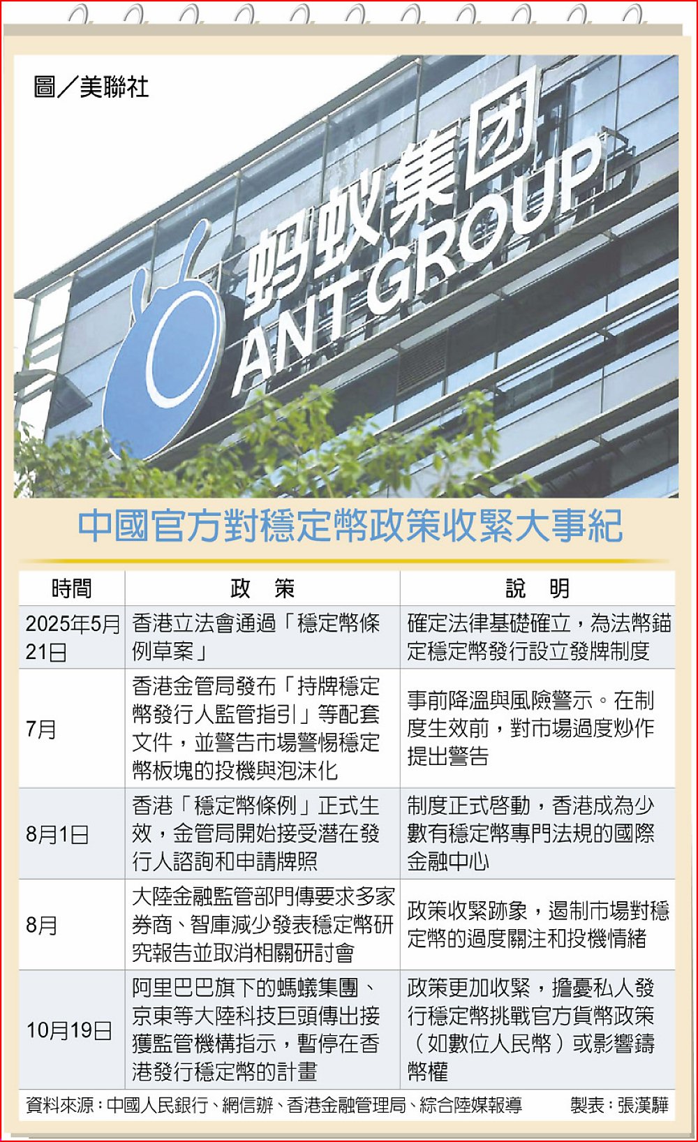 螞蟻集團與京東原先均參與香港金管局推動的穩定幣計畫,但在接獲中國人民銀行及網信辦等監管機構的指示後,兩家公司已暫停相關作業。