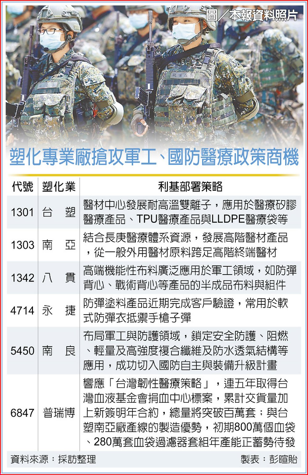 地緣政治催化各國國防軍備投資、需求活絡開展,塑化專業廠八貫(1342)、南良(5450)、永捷(4714)積極部署軍工、軍備防護商機。