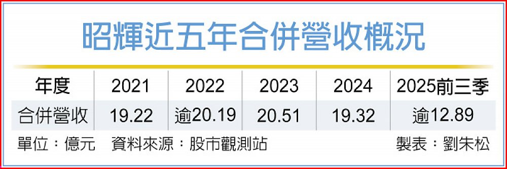 除台灣廠,昭輝在大陸有三個廠,除了生產模具的安徽廠,公司併購大陸常熟冠林、遼寧廠之後,已切入大陸瀋陽寶馬(BMW)汽車供應鏈。
