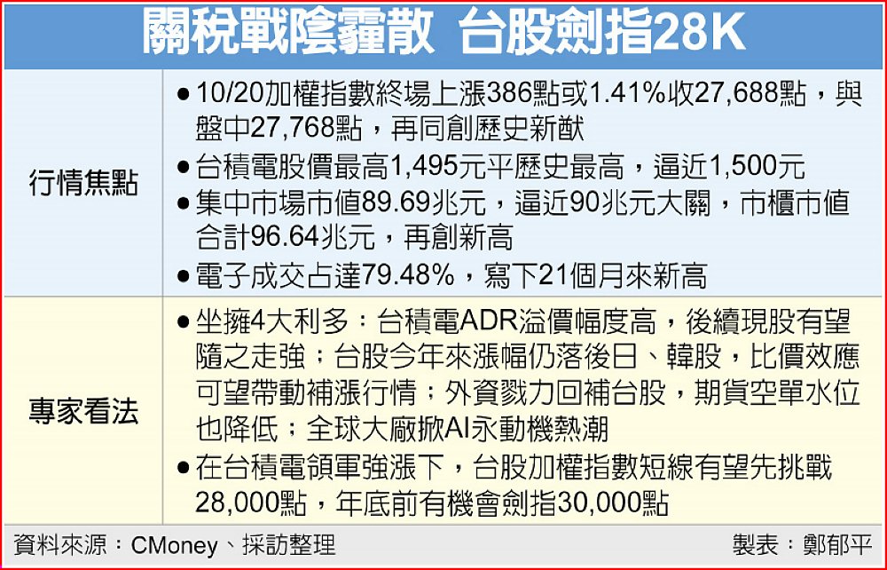 國際利空消息鈍化,台股20日在權王台積電直奔1,495元、朝1,500元整數大關進逼領軍下,與主要亞股齊強勢走揚,盤中最高大漲465點至27,768點、終場上漲386點收27,688點,同創歷史新高。法人看好台股本周就有望攻下28,000點城池,年底前在台積電與AI族群強漲激勵下朝30,000點進攻。
