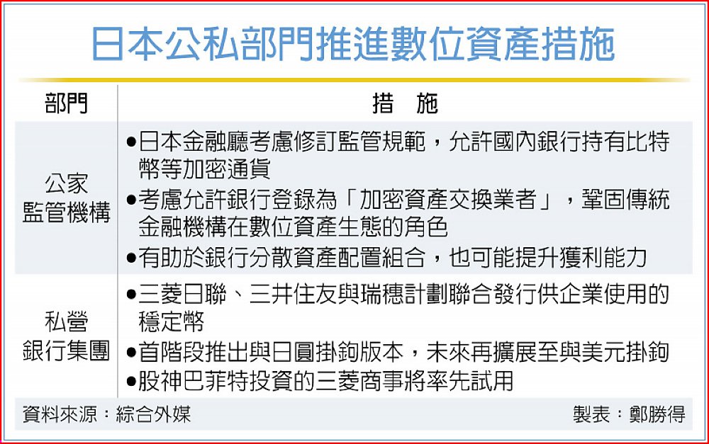 日本三大金融集團將計畫聯手發行與日圓掛鉤的穩定幣,其中股神巴菲特投資的三菱商事等商社將率先使用穩定幣作為內部財務結算。另外,日本金融廳(FSA)正考慮修訂監管規範,改變過去保守監管政策,允許國內銀行基於投資目的購買並持有比特幣等加密幣,這也意味在公家監管機構與民營金融巨擘雙軌推動下,數位資產可望加速打入日本主流經濟。