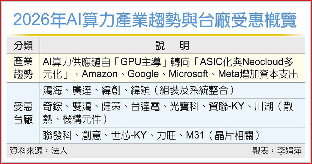 全球資料中心資本支出2026年近逼5,000億美元,AI運算正從「GPU獨霸」邁向「ASIC化與Neocloud(新世代雲端)多元化」新時代。法人預期,這場由Neocloud帶起的「算力去中心化革命」將重塑全球AI供應鏈版圖,台廠憑藉在先進晶片設計、伺服器整合與散熱電源系統的完整實力,可望搶下次世代AI基礎建設大餅,成為最大受惠群。