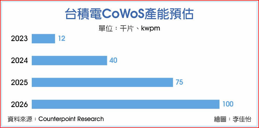 值得注意的是,先進封裝需求持續穩定,Foundry 2.0持續推進,台積電、三星、英特爾三大業者積極搶進。台積電董事長魏哲家於法說會表示,仍努力「縮小供需之間的缺口」(Narrow the gap),Counterpoint預估,台積電計畫至2026年底前將CoWoS月產能提升至10萬片晶圓,主要客戶包括輝達、AMD、蘋果及大型雲端服務商(CSP)。
