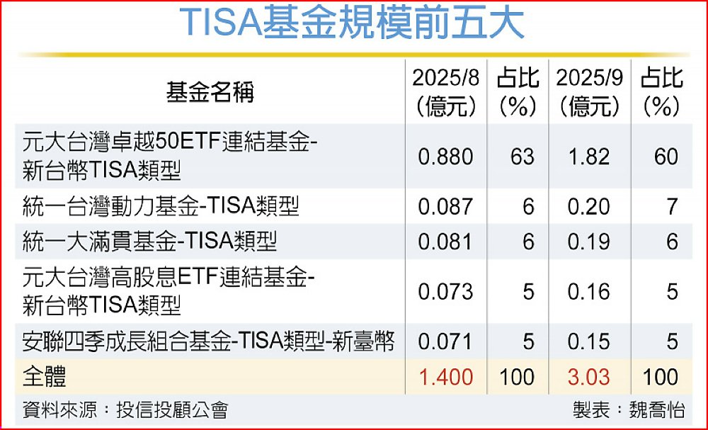 統計9月TISA級別基金前三名,分別是元大台灣卓越50 ETF(0050)連結基金(TISA級別),規模達1.82億元、一檔就占整體規模6成,較8月8,830萬元翻倍成長;第二名是統一台灣動力基金(TISA級別),規模約2,000萬元,占比達7%;第三名是統一大滿貫基金(TISA級別),1,850萬元,占比6%,也都是翻倍成長。