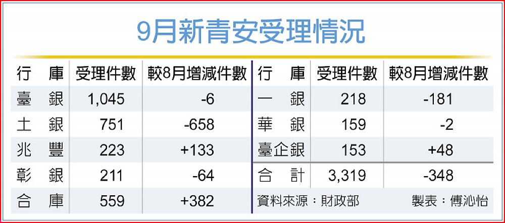 合計行庫9月新青安受理件數3,319件是開辦後歷月最少,但行庫相較8月受理增減明顯兩極化,例如先前幾乎已完全沒額度的合庫銀,在72-2鬆綁後,9月受理件數較8月大增382件至559件,兆豐銀也增加133件至223件,臺企銀則是增加了48件。