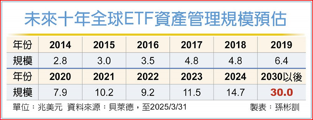 貝萊德20日舉行簡報會,貝萊德亞太區iShares主管Nicholas Peach分析,全球ETF資產管理規模已經從2014年的2.8兆美元成長至2024年的14.7兆美元,預計2030年後,也就是未來十年,將會翻倍至30兆美元。