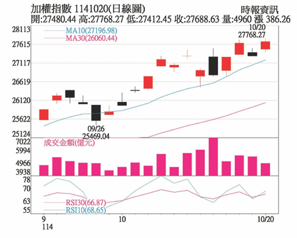 台股部分,上周台積電財報再度交出亮眼成績,第三季營收331億美元,季增10.08%、年增40.85%,超越318億至330億美元預估區間(季增6%~10%),AI與HPC需求維持強勁帶動毛利率與營業利益率雙雙優於指引,第三季EPS為17.44元,市場對台積電全年平均EPS預估提升至63.06元,2026年平均EPS預估74.98元,受到台積電預估獲利提升,近期台股也重回27,000點之上。技術面,上周台股一度回測10日線,目前台股仍在短中長期均線上,加上技術指標MACD呈現翻揚,短線拉回10日線(27,196點)為觀察指標。選股方向,AI生成應用崛起,帶動主要CSP雲端大廠進行AI伺服器軍備競賽,台積電、廣達、緯創、緯穎、台達電、川湖、勤誠、鴻海將受惠。PCB上游應用於AI Server、Switch交換器板之高階材料如HVLP銅箔、載板材料T-Glass、硬板材料Low-DK等高階材料供貨仍緊,定穎投控、金居、台燿、金像電、華通可留意;雲端運算推升邊緣運算需求,研華、安勤、融程電、飛捷可留意;SpaceX、Amazon Kuiper積極布署低軌衛星,啟碁、昇達科將受惠。
