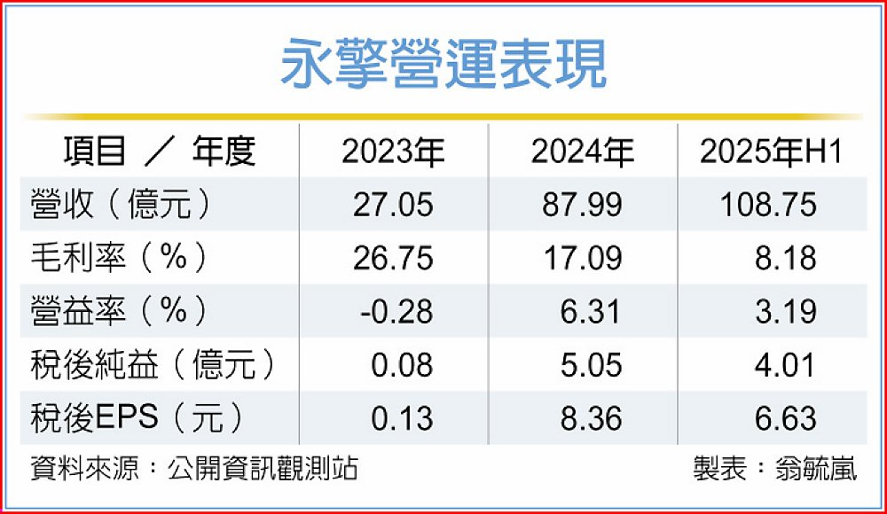 永擎2025年度營收約88億元,年度稅後純益5.05億元,全年每股稅後純益8.36元。今年前九月累計營收175.11億元,累計上半年稅後純益為4.01億元,上半年EPS達6.63元,營運展現強勁爬升動能。