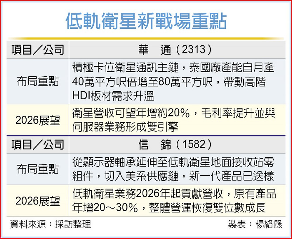 低軌衛星通訊正成為台廠新戰場,原本深耕消費電子領域的HDI(高密度互連板)大廠華通(2313)與軸承廠信錦(1582),近年同步將布局延伸至太空軌道,從智慧手機、顯示器跨入衛星通訊主鏈與地面接收站零組件,積極卡位「軌道經濟」。法人預期,兩家公司將於2026年迎來低軌業務放量,成為下一波營收成長引擎。