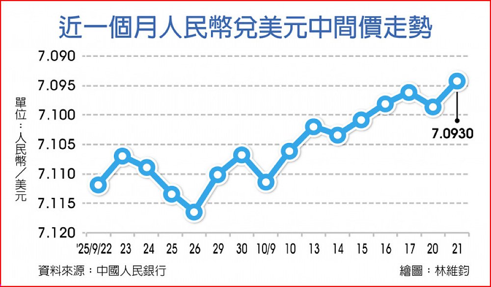 隨著中美高層經貿談判出現進展、關稅暫休兵,中間價5月起再緩步升值,近日更是一舉升破7.1元價位。今年截至10月21日,中間價累計升幅1.34%,在岸價累計升幅2.55%。