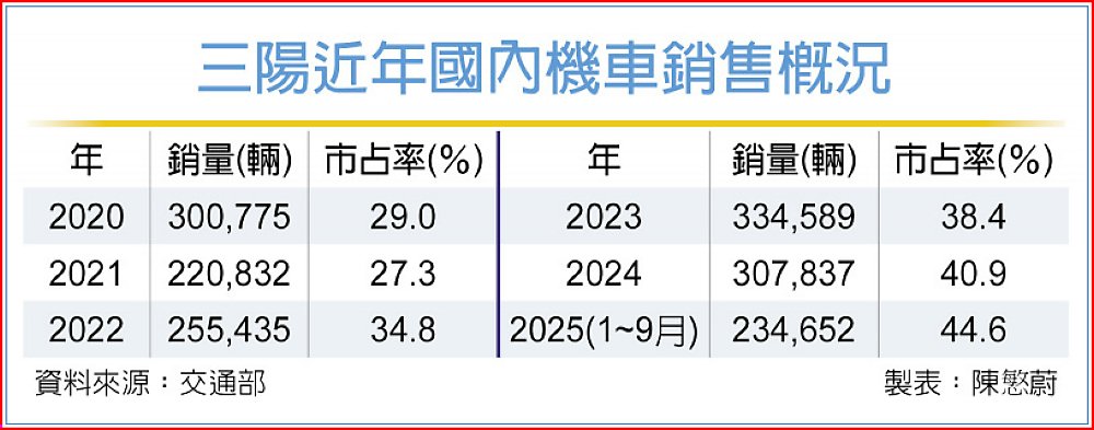 機車業龍頭三陽(SYM)力拚成為今年唯一逆勢成長品牌,董事長吳清源21日表示,受雙稅政策與景氣不確定影響,今年國內機車市場明顯疲軟,全年規模估將較去年衰退約5%,最好也僅約75萬輛。不過,三陽前九月領牌仍達23.47萬輛、年增1.52%,是前三大品牌中唯一成長者,全年目標逆勢成長2%~3%,市占率可望挑戰45%。